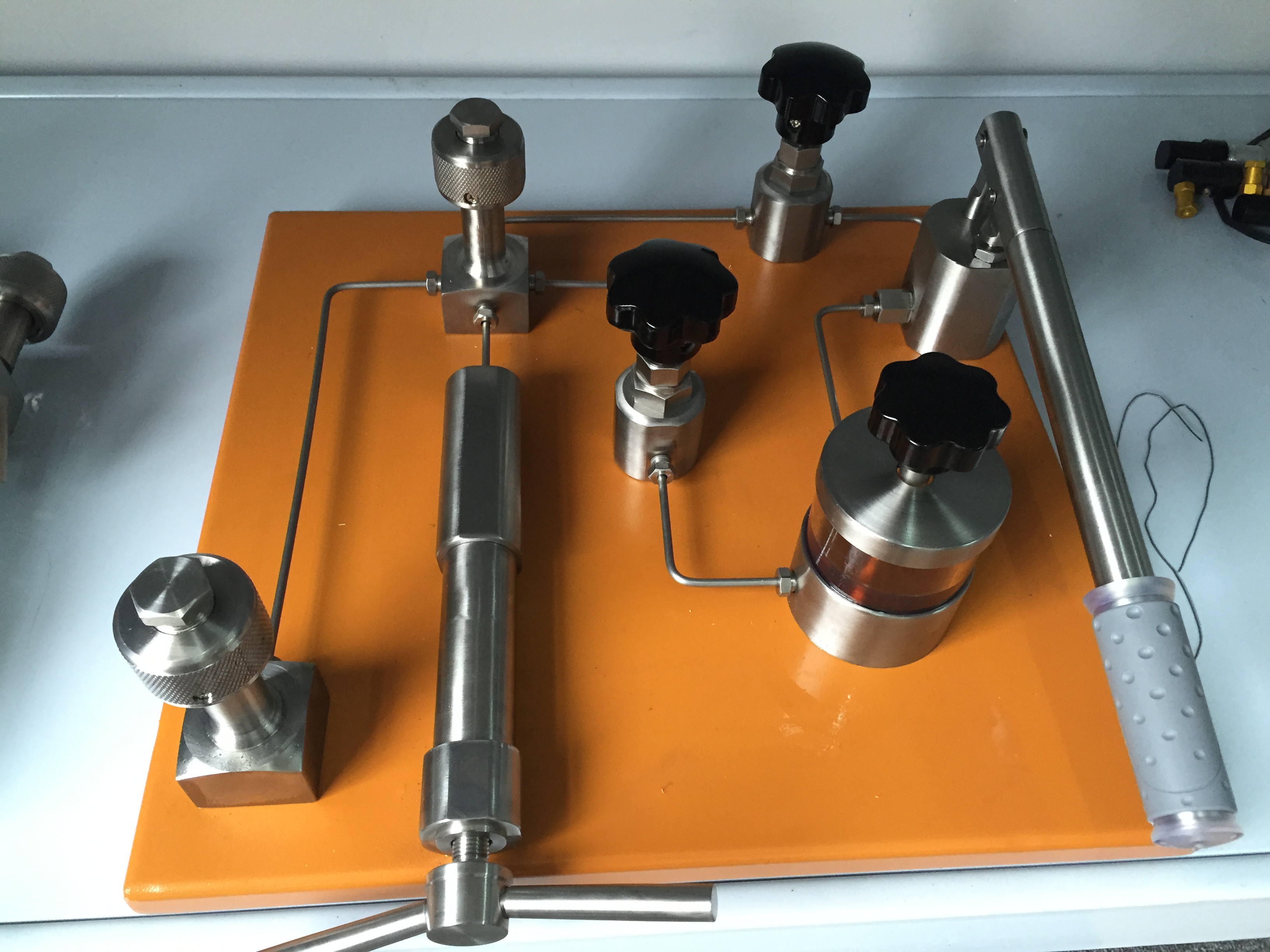 堵頭,接標(biāo)準(zhǔn)表和被檢表,打開穩(wěn)壓閥,將微調(diào)調(diào)至適當(dāng)位置(中間位置),關(guān)閉放氣閥。操作杠桿加壓到2~3MPa時(shí),使用微調(diào)將壓力調(diào)到6.2MPa左右,穩(wěn)定1~2分鐘,使用微調(diào)調(diào)至檢定點(diǎn),關(guān)閉穩(wěn)壓閥,逐點(diǎn)檢測(cè)至零點(diǎn)。