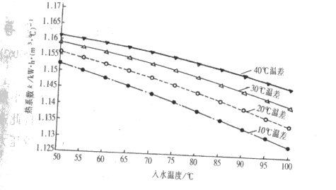圖2給出了在流量計(jì)安裝在回水管,壓力為0.6MPa, 溫差為10~40℃時(shí),熱系數(shù)與入水溫度的關(guān)系曲線。由圖2可以看出,在工作壓力和溫差保持不變的情況下,入口溫度越高,熱系數(shù)越低;入口溫度保持不變時(shí),溫差越大,熱系數(shù)越大。