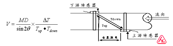 當(dāng)超聲波束在液體中傳播時,液體的流動將使傳播時間產(chǎn)生微小變化,并且其傳播時間的變化正比于液體的流速,其關(guān)系符合下列表達式: