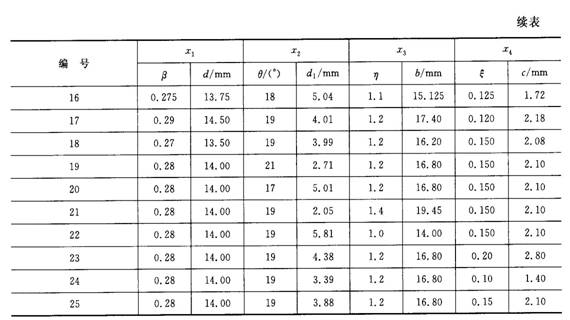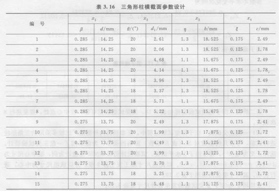 三角柱的截面[圖3.28 (b)]有4個(gè)幾何參數(shù)。如果每個(gè)參數(shù)取3個(gè)水平,則有34=81種組合;如取4個(gè)水平,則有44 =256種組合??紤]到采用回歸分析方法得出數(shù)學(xué)模型時(shí),還有各種參數(shù)的交互作用,回歸系數(shù)一般不止4個(gè)。所以如果不采用最優(yōu)化試驗(yàn)設(shè)計(jì),加工樣品的數(shù)量及試驗(yàn)次數(shù)都是巨大的,試驗(yàn)時(shí)間和經(jīng)費(fèi)相當(dāng)可觀。為此,采用兩種優(yōu)化設(shè)計(jì),即二次回歸通用設(shè)計(jì)和一般正交設(shè)計(jì)。