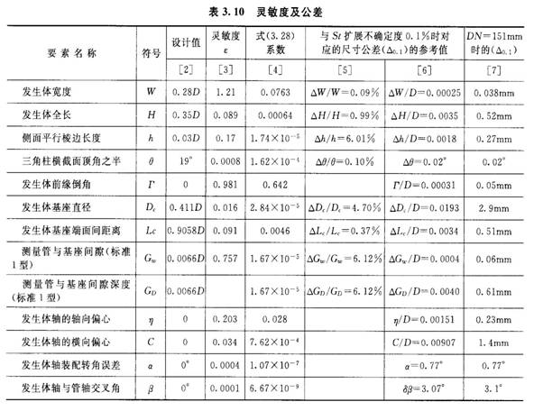 表3.10中列出了斯特勞哈爾數(shù)St對(duì)各尺寸的靈敏度及公差要求,制造廠可根據(jù)式(3.28)按預(yù)定的擴(kuò)展不確定度,設(shè)計(jì)計(jì)算出不同口徑發(fā)生體的各結(jié)構(gòu)要素的尺寸值和公差值。