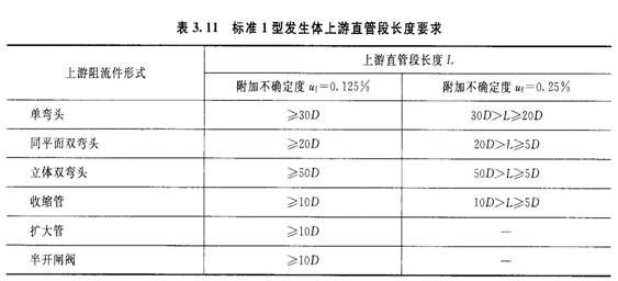 式(3. 28)中還包括上游直管段長(zhǎng)度的附加不確定度。表3.11和表3. 12中分別列出了標(biāo)準(zhǔn)1型和標(biāo)準(zhǔn)2型發(fā)生體所要求的上游直管段長(zhǎng)度及附加不確定度。從表中可看出附加不確定度u£減小,所要求的直管段應(yīng)增加。