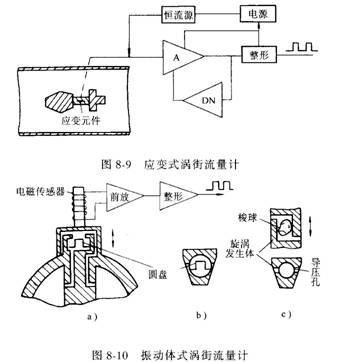 旋渦發(fā)生體兩側(cè)的旋渦交替分離時,柱體將受到交變的橫向外力作用,從而產(chǎn)生相應(yīng)的形變。因此,可以利用埋于雙旋渦發(fā)生體靈敏部位的應(yīng)變元件,通過測量應(yīng)變來檢測旋渦分離頻率。通過自動增益控制A放大電路和整形電路,獲得渦街信號。這種儀表檢測靈敏度較低,目前只用于液體和有一定粘度的糖漿、重油流量測量。其測量原理如圖8-9所示。