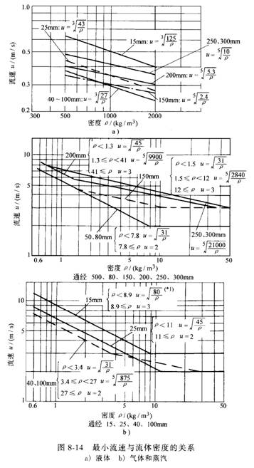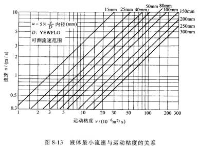測量范圍分為流速可測范圍和保證測量精度的流速范圍??蓽y流速范圍的最小流速與被測介質(zhì)粘度和密度有關(guān),如圖8-13和圖8-14所示為YEWFLO例。保證精度的最小流速為圖8-13中的值和圖8-14中值的4倍(對于150mm到300mm口徑的取8倍)中取較大者。最大流速對于液體一般小于10m/s,對于氣體或蒸汽,一般小于80m/so