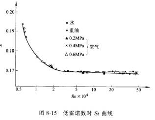 式中,u1是旋渦發(fā)生體兩側(cè)平均流速(m/s);d是旋渦發(fā)生體特征寬度(m); St是斯特勞哈爾數(shù)(Strouhal無量綱系數(shù)),斯特勞哈爾數(shù)與旋渦發(fā)生體的形狀及雷諾數(shù)有關(guān),圖8-2所示為圓柱形旋渦發(fā)生體的斯特勞哈爾數(shù)與雷諾數(shù)之間的關(guān)系圖,由圖8-2可知,當(dāng)雷諾數(shù)Re在2′ 104-7′ 106的范圍St基本是一個常數(shù),m是旋渦發(fā)生體兩側(cè)弓形面積與管道內(nèi)橫截面積之比對于直徑為d的圓柱形旋渦發(fā)生體