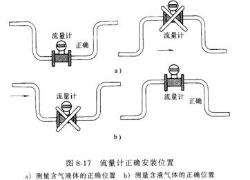 測量氣體時,管道中可能存在少量沒有完全排除的不穩(wěn)定液相或所測氣體或蒸汽由于冷卻降溫而產(chǎn)生冷凝液。為防止液體在傳感器內(nèi)滯留,應(yīng)按圖8-17b所示正確位置安裝,最好能垂直安裝,流體自下而上通過傳感器。測高、低溫流體時傳感器自身應(yīng)有有效的保溫措施。
