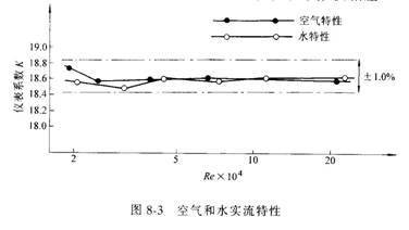 渦街流量計可以測量液體流量,也可以測量氣體流量。其儀表系數(shù)與管道雷諾數(shù)之間的關(guān)系如圖8-3所示,我們稱為流量計的特性曲線。從圖中可以看出,該特性不受流體的壓力、溫度、粘度、密度、成分的影響,而且水的特性與空氣的特性基本一致。也即水標(biāo)定的渦街流量計用于氣體,儀表系數(shù)僅相差0.5%左右,不會引起明顯誤差。