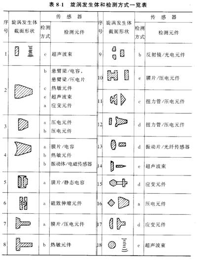 根據(jù)這五種檢測方式,采用不同的檢測技術(shù)就構(gòu)成了不同類型的渦街流量計,表8-1為各種旋渦發(fā)生體常用的檢測方式一覽表。