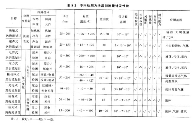 響應(yīng)特性,復(fù)現(xiàn)性和互換性好,體積小,不因它的安裝而影響儀表的流量特性;適合批量生產(chǎn),造價合理,能適應(yīng)不利(腐蝕、振動、高低溫、沖刷)的工作條件,工作可靠。表8-2列出了不同檢測方法渦街流量計及性能。