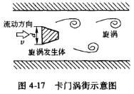 一體式渦街流量計是利用流體力學中卡門渦街的原理制作的一種儀表,它是把一個稱做旋渦發(fā)生體的對稱形狀的物體(如圓柱形、棱柱形、T柱形等)垂直插在管道中,流體繞過旋渦發(fā)生體時,出現(xiàn)附面層分離,在旋渦發(fā)生體的左右兩側(cè)后方會交替產(chǎn)生旋渦,如圖4-17所示,左右兩側(cè)旋渦的旋轉(zhuǎn)方向相反。這種旋渦列通常被稱為卡門旋渦列,也稱卡門渦街。
