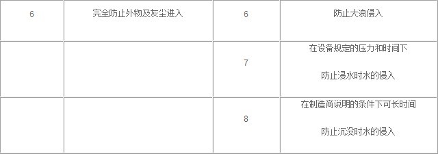 平時(shí)所見的防護(hù)等級(jí)都用IP加兩位數(shù)字來(lái)表示,其中IP為防護(hù)等級(jí)的標(biāo)示,第一位數(shù)字表示含義對(duì)應(yīng)下表: