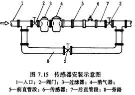 水平安裝的傳感器要求管道不應(yīng)有目測(cè)可覺察的傾斜(一般在5度以內(nèi)),垂直安裝的傳感器管道垂直度偏差亦應(yīng)小于5度。需連續(xù)運(yùn)行不能停流的場(chǎng)所,應(yīng)裝旁通管和可靠的截止閥(見圖7.15),測(cè)量時(shí)要確保旁通管無泄漏。