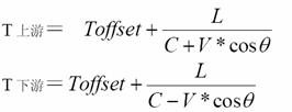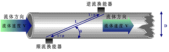 在圖1 中我們看到有兩個(gè)換能器,順流換能器和逆流換能器,兩只換能器分別安裝在流體管線的兩側(cè)并相距一定距離,管線的內(nèi)直徑為D,超聲波行走的路徑長(zhǎng)度為L(zhǎng),超聲波順流時(shí)間為T 上游,逆流時(shí)間為T 下游,超聲波的傳播方向與流體的流動(dòng)方向加角為θ,流體的流動(dòng)速度為V。由于流體流動(dòng)的原因,是超聲波順流傳播L 長(zhǎng)度的距離所用的時(shí)間比逆流傳播所用的時(shí)間短,其時(shí)間差可用下式表示: