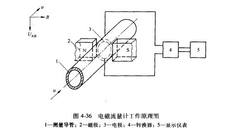 與此相似,如果在磁感應(yīng)強度為B的均勻磁場中,垂直于磁場方向有一個直徑為D的管道,如圖4-36所示。管道由不導(dǎo)磁材料制成,管道內(nèi)表面襯掛絕緣襯里。當(dāng)導(dǎo)電的液體在導(dǎo)管中流動時,導(dǎo)電液體切割磁力線,于是在和磁場及液體流動方向垂直的方向上產(chǎn)生感應(yīng)電動勢,三者的方向如圖4-36所示。如果在管道截面上安裝一對電極,則兩電極間將產(chǎn)生感應(yīng)電勢UAB,即