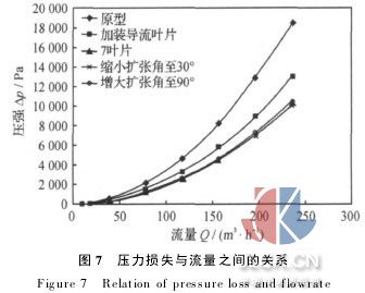 圖7為壓力損失與流量的關(guān)系.圖中可以看出,原型流量計(jì)的起旋器前端加裝螺旋導(dǎo)流葉片后,壓損有了明顯的減小.流體進(jìn)入流量計(jì)前為是充分發(fā)展管流,進(jìn)入流量計(jì)后首先通過的是相當(dāng)于一個(gè)阻流件的起旋器,流體受到起旋器前端葉片的阻擋,當(dāng)未加導(dǎo)流葉片時(shí),會發(fā)生嚴(yán)重的流動(dòng)分離,從而帶來很大的能量損失;而前端增加螺旋導(dǎo)流葉片,流體以平行于流場的角度引導(dǎo)流體順利并呈螺旋狀流入起旋器起旋葉片,避免發(fā)生流動(dòng)分離,壓力損失得以減小.當(dāng)增加葉片數(shù)量至7片后,壓力損失比6個(gè)葉片時(shí)進(jìn)一步減小,這是因?yàn)樵谠黾尤~片數(shù)量的同時(shí)減小了葉片厚度,流通面積面反而增大.從圖7還可以看出,將擴(kuò)張段角度縮小至30°和增大至90°時(shí),壓損曲線與60°(即原型)的情況相比基本沒有變化,說明了在流量計(jì)壓損方面,擴(kuò)張角大小影響不大,起旋器的影響是主導(dǎo)因素.