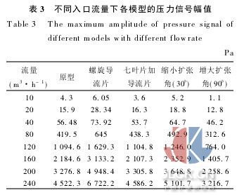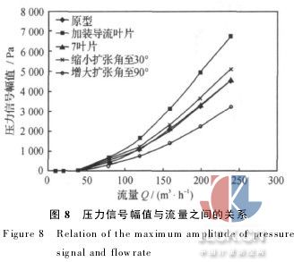 圖8為各模型壓力信號幅值與流量的關(guān)系圖,可看出在起旋器前端加裝螺旋導(dǎo)流葉片后,壓力信號有了明顯的增強(qiáng),平均增幅達(dá)到49%.葉片數(shù)增加至7片后壓力信號幅值比6片時(shí)有較大減弱,不可取.擴(kuò)張角縮小至30°后信號較60°時(shí)變?nèi)?擴(kuò)張角增大至90°時(shí)信號最弱,可見擴(kuò)張角不是越大越好,也不是越小越好,就本文數(shù)據(jù)來說,60°是最好的一個(gè)選擇.