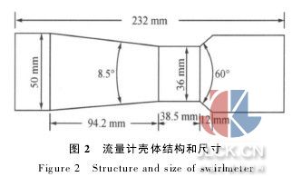 針對現(xiàn)有旋進(jìn)旋渦流量計(jì)壓損大、小流量信號弱等問題,提出了結(jié)構(gòu)改進(jìn)和參數(shù)優(yōu)化研究方案.改進(jìn)對象為一個(gè)dn50氣體旋進(jìn)旋渦流量計(jì),其內(nèi)部結(jié)構(gòu)和寸見圖2.流量計(jì)長度為232 mm,入口管徑50 mm,收縮段長度94.2 mm,發(fā)展段管徑為36 mm、長度為35.8 mm,擴(kuò)張段長為12 mm,擴(kuò)張角度為60°.具體改進(jìn)和參數(shù)優(yōu)化研究如下: