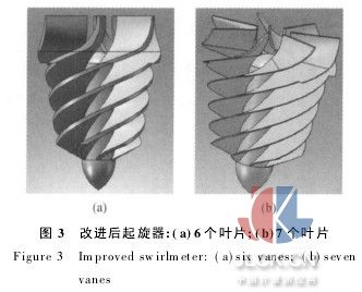 2)起旋器葉片數(shù)量增加.起旋器原來的葉片數(shù)量是6片,考慮增加1片(圖3b),同時(shí)為了保證流動(dòng)面積不減小,將葉片厚度由2.5 mm變?yōu)?.5 mm(當(dāng)前加工能力能夠做到).螺旋角度保持不變,仍為30°.