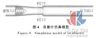 流量計(jì)內(nèi)部為湍流流動(dòng),需引入湍流模型.標(biāo)準(zhǔn)的k-ε湍流模型用于強(qiáng)旋流或帶有彎曲壁面的流動(dòng)時(shí),會出現(xiàn)一定失真,因此本文選用rngk-ε湍流模型.湍流模型和相關(guān)方程在文獻(xiàn)[11]中有詳細(xì)說明,感興趣的讀者可參考這篇文獻(xiàn).