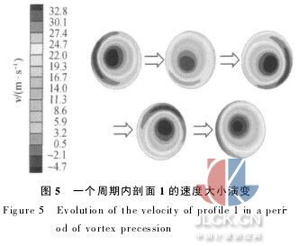 圖5是針對原型流量計(jì)內(nèi)部流場的模擬結(jié)果(一個(gè)旋渦進(jìn)動(dòng)周期),流量為80 m3/h.可以看到,在靠近壁面處速度明顯高于其他部位,而管道中心處由于回流的影響呈負(fù)速度分布,并且壁面高速流呈逆時(shí)針做圓周狀運(yùn)動(dòng),即管道流體在擴(kuò)張段做螺旋進(jìn)動(dòng).