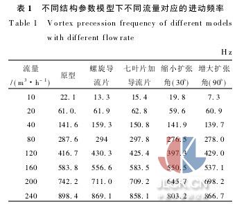 旋進(jìn)旋渦流量計(jì)是基于旋渦進(jìn)動(dòng)現(xiàn)象工作的[12].流體流入旋進(jìn)旋渦流量計(jì)后,首先通過一組由固定螺旋形葉片組成的起旋器后被強(qiáng)制旋轉(zhuǎn),使流體形成旋渦流.旋渦中心為“渦核”是流體旋轉(zhuǎn)運(yùn)動(dòng)速度很高的區(qū)域,其外圍是環(huán)流.流體流經(jīng)收縮段時(shí)旋渦加速,沿流動(dòng)方向渦核直徑逐漸縮小,而強(qiáng)度逐漸加強(qiáng).此時(shí)渦核與流量計(jì)的軸線相一致.當(dāng)進(jìn)入擴(kuò)大段后,旋渦急劇減速,壓力上升,中心區(qū)域的壓力比周圍的壓力低,于是產(chǎn)生了局部回流.在回流作用下,渦核偏離中心軸像剛體一樣在擴(kuò)張段壁面做螺旋進(jìn)動(dòng),并且是圍繞中心軸進(jìn)行的.進(jìn)動(dòng)頻率與流體的流速成正比.因此,測得旋進(jìn)旋渦的頻率即能反映流速和體積流量的大小.