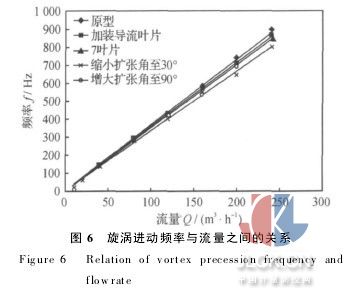 表1列出了各種結(jié)構(gòu)參數(shù)情況下的旋渦進(jìn)動(dòng)頻率數(shù)據(jù),這些數(shù)據(jù)繪制成旋渦進(jìn)動(dòng)頻率-流量關(guān)系圖(圖6).圖中可以看出,對于研究涉及到的所有參數(shù)組合,旋渦進(jìn)動(dòng)頻率與流量之間都保持良好的線性關(guān)系.