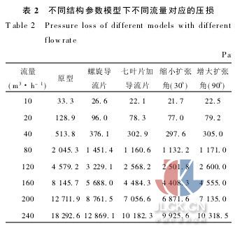 在研究流量計(jì)壓損變化時(shí),我們在計(jì)算模型的入口處與出口處分別設(shè)置監(jiān)測截面,入口壓力值減去出口壓力值即作為流量計(jì)壓力損失.不同流量,各種結(jié)構(gòu)參數(shù)情況下的壓損列于表2.