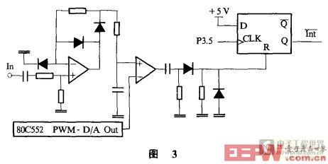 另外,為了防止干擾波及發(fā)射波寬度和多次回波的重疊對測量的影響,本設(shè)計(jì)在接收回波的電路中,增加了一個(gè)電平可變的門限,該電平由80C552的PWM脈寬調(diào)制端通過必要的接口電路形成的D/A轉(zhuǎn)換器的輸出提供。門限電平的高低應(yīng)盡量使產(chǎn)生回波的中斷時(shí)刻發(fā)生在靠近回波波形的中心位置,以減小波形寬度對測量時(shí)間的影響。
