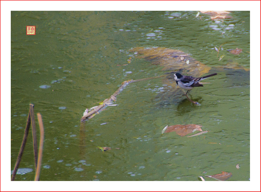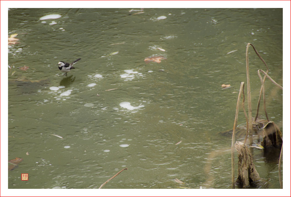 < 荷花蕩殘荷與嬉戲的翠鳥