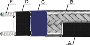電源母線為三根平行絕緣銅線,在內(nèi)護(hù)套絕緣層上纏繞電熱絲,并將電熱絲每隔一定距離(即“發(fā)熱切長”)分別依次與母線反復(fù)循環(huán)連接,在每二相間形成連續(xù)并聯(lián)電阻。母線通電后,各并聯(lián)電阻發(fā)熱,因而形成一條連續(xù)的加熱帶。