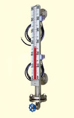 控制型是在翻柱液位計(jì)的基礎(chǔ)上增加了磁控開關(guān),在監(jiān)測(cè)液位的同時(shí)磁控開關(guān)信號(hào)可用于對(duì)液位進(jìn)行控制或報(bào)警;遠(yuǎn)傳型是在翻柱液位計(jì)的基礎(chǔ)上增加了 4~20mA 變送傳感器,在現(xiàn)場(chǎng)監(jiān)測(cè)液位的同時(shí)將液位的變化通過變送傳感器、線纜及儀表傳到控制室,實(shí)現(xiàn)遠(yuǎn)程監(jiān)測(cè)和控制。